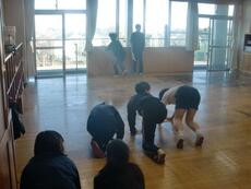 その後、放送の指示を聞いて、今日は校庭(グラウンド)ではなく、体育館に急いで避難しました。