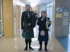 バクパイプ奏者のアリーさんとドミニクさんのお二人をお迎えして三年生を送る会が体育館で行われました。