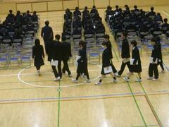 体育館において、卒業式の練習を行いました。クラスごとに担任の先生と一緒に入場して着席をするまでの流れなどの練習をしました。
