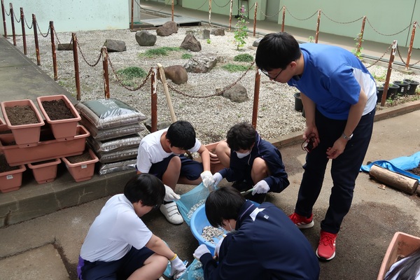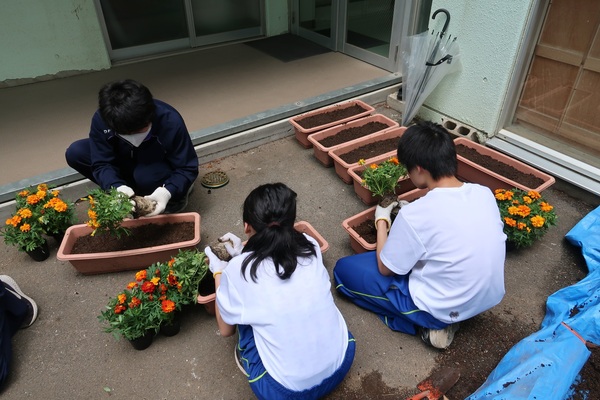 今回は、I学級の生徒たちがプランターにマリーゴールドを植えました。