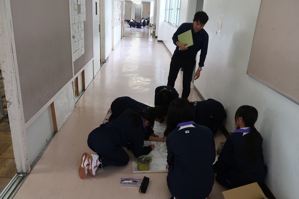 美術部は、運動会のスローガンの大きな旗を作成しています。