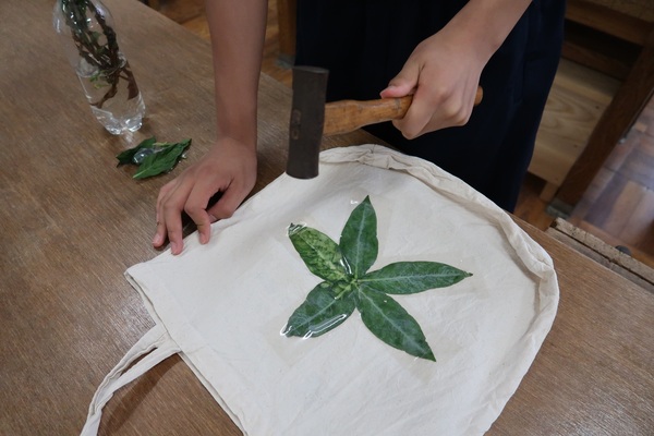 その葉っぱを、金づちで叩いて、エコバッグを染めていきます。