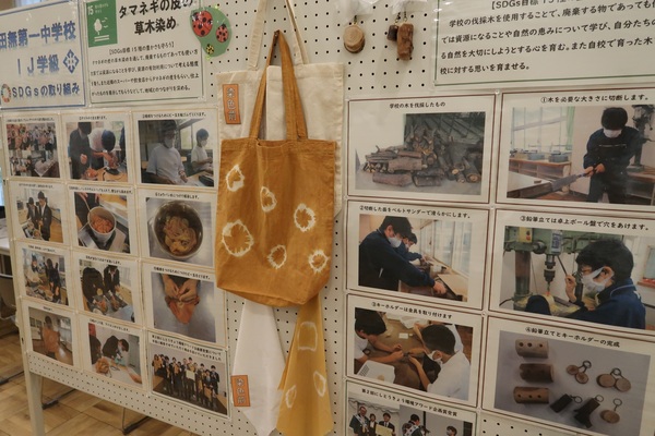 一中からは、IJ学級が「タマネギの皮の草木染め」と「学校の伐採木を使ったキーホルダーと鉛筆立て作り」を展示しました。