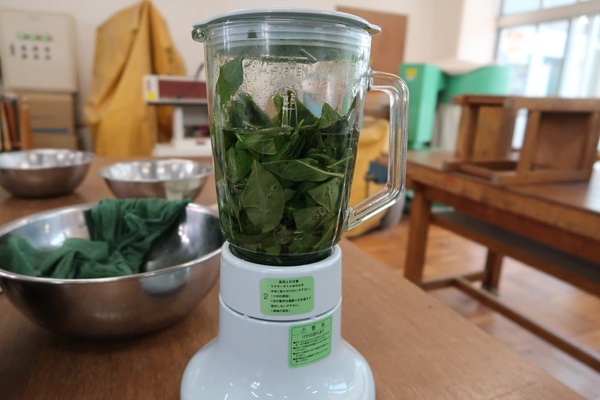 ミキサーで葉をすりつぶし、布で濾した染色液で染めていきます。