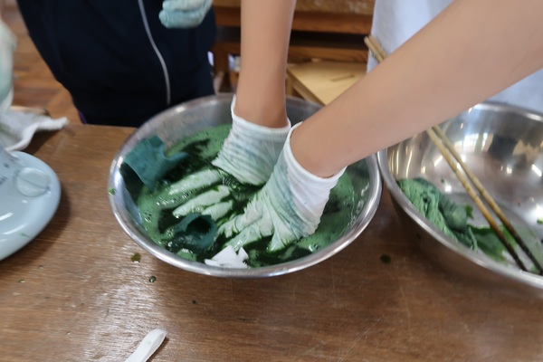 前回は「叩き染め」に取り組んだ生徒たちは、今回「生葉染め」に挑戦です。
