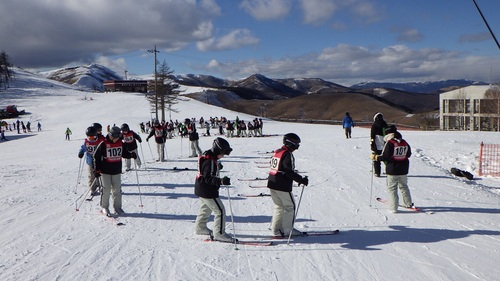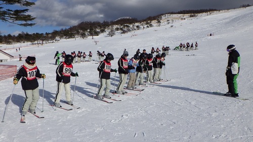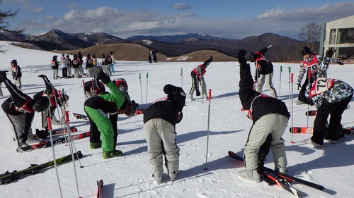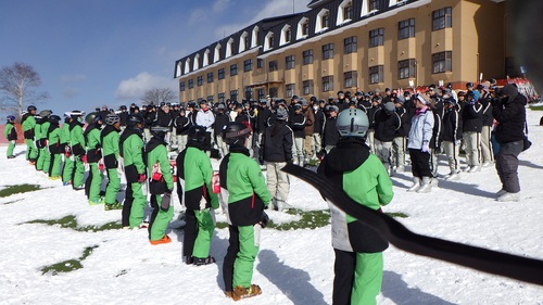 白樺湖ロイヤルヒルでの2泊3日のスキー移動教室です。ホテルの前で開校式 晴天に恵まれています。