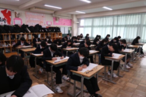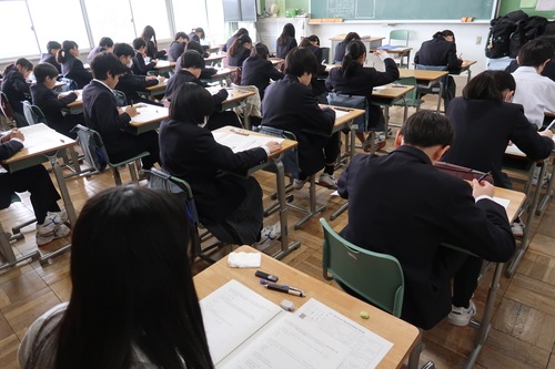 年度末の定期考査です。みんな真剣にテスト用紙に向かい合っています。