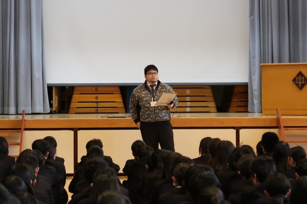 生活指導主任の先生は、仲間と協力しながら、安全に安心して学校生活を送っていこうという話をされました。