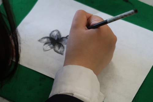 水墨画の授業です。今日の目標や授業の流れが提示されます。