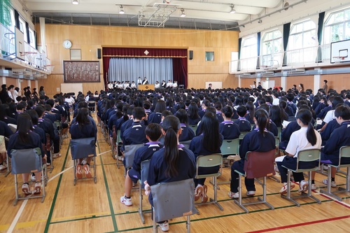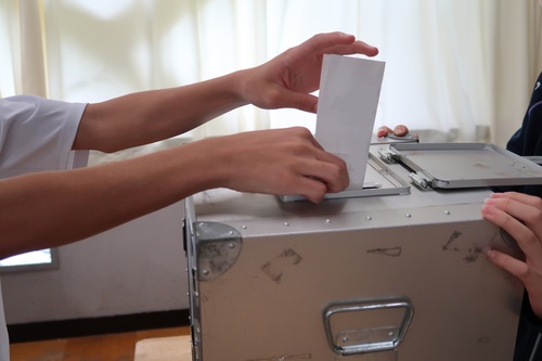 次の生徒会会長、および執行委員を選ぶための選挙です。投票に先立ち、体育館では立候補者による立会演説会が行われました。各立候補者は、緊張しながらも自分の考えをしっかりと伝えることができました。