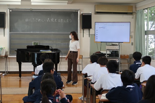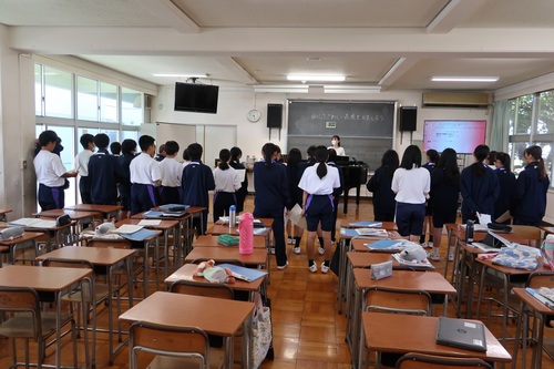 合唱コンクールに向けて、歌唱の授業です。この時間のめあては「曲にふさわしい表現を工夫しよう」です。
