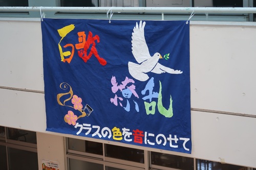 美術部は運動会や合唱コンクールといった行事の際に、スローガンの旗や看板を製作しています。今年の合唱コンクールの会場では、看板が掲示できないため、応援プロジェクトとして階段アートと旗づくりに取り組みました。