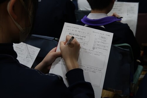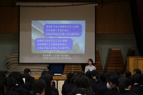 自分がかけがえのない存在であることに気付くとともに、ストレスへの様々な対処方法について理解を深めることを目的として、毎年2年生を対象に行っています。