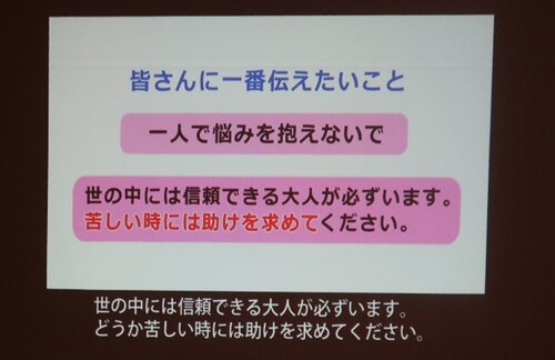 「人は皆、様々なストレスを抱えながら生きています。人との関わりに関すること、将来や進路の不安など、人によってストレスは様々です。ストレスに押しつぶされそうなときに、「自分だけ辛い」「自分だけが不安でダメだ」と考えてしまうものですが、ストレスとを感じた時には、発散することを考えてください。周りの大人や話せる人に話してみるなど、自分一人で抱え込まずに、周りに助けを求めてください。」