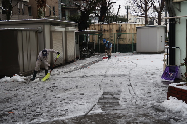 登校してくる生徒たちのために、朝早くから先生や主事さんたちが雪かきをして安全を確保しました。