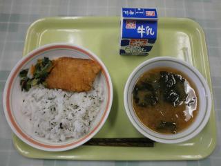 今日の献立は、わかめご飯、牛乳、いかの甘辛揚げ、小松菜の辛し和え、みそ汁でした。