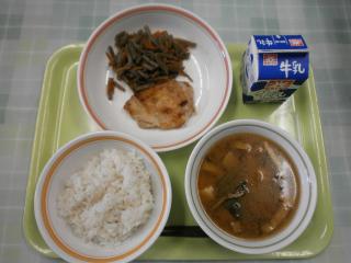 今日の献立は、群馬県の郷土料理でを取り入れました。麦ご飯、牛乳、鶏肉のおかりば焼き、こんにゃくのきんぴら、こしね汁でした。