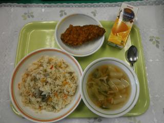 今年度最後の献立は、メキシカンピラフ、みかんジュース、クリスピーチキン、春野菜とレンズ豆のスープでした。