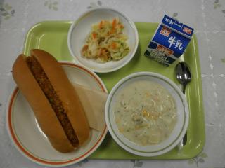 今日の献立は、ミートドック、牛乳、コールスローサラダ、クラムチャウダーでした。クラムチャウダーの中には、むき身あさりのほかに白いんげん豆などが入りました。