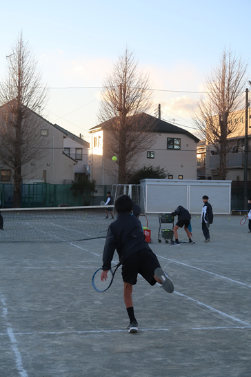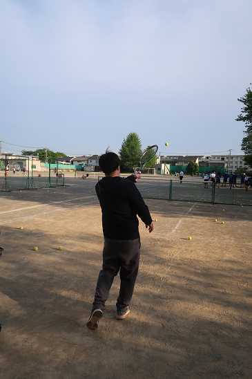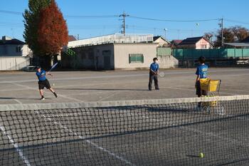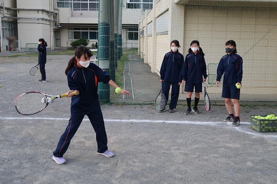 ボレー練習。顧問の出すボールに素早く反応し、相手
