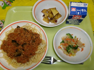 ★メランザーネポモドーロパスタ・・・今日のパスタは1年生の地産地消プロジェクト(NCP)によって考案されたものを給食メニューにしています。