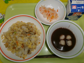 ★1月15日・・・暦の上では「小正月」です。昔から邪気を払うと云われている「小豆」を入れたお粥を食べたり 焼いたお餅を食べたりすると病気にならないと云われています。 お祝い事などにお赤飯を炊きますが、」これも災いを避ける力のある「朱色の小豆」を入れてご飯を食べることで「転じて福を呼び込む」と云う意味があると云われています。 これにちなんで今日の給食でも「小豆」が使用されています。