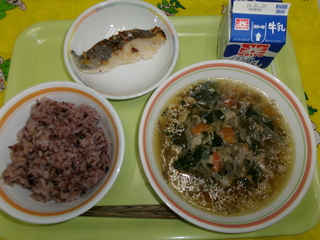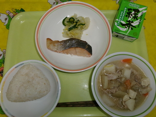 ★毎年1月24日から30日は「全国学校給食週間」です。給食の歴史や給食の意味を考える一週間です。 住吉小学校と田無二中では今日から金曜日まで「全国学校給食週間メニュー」になっています。日本で最初の給食は明治22年(今から約130年前)山形県・鶴岡町の小学校で出された「おにぎり・焼き魚・漬物」が学校給食の始まりと云われています。今日の給食では当時の給食を再現しています。しかし、それだけでは栄養価が足りないので豚汁を付けてあります。 残さずにいただきたいですね。
