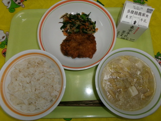 *麦ご飯 *鯵のメンチカツ *小松菜のひじき和え