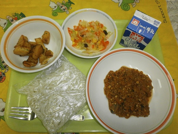 今日の給食のミートソースの麺は「ソフト麺」を使用しています。ソフト麺は昭和38年に初めて給食に登場し、昭和50年代まで多く食されていました。当時は、ソフト麺を使用した「ミートソース」が人気メニューとして出ていました。以前の給食よりも使用食材も増え栄養価はもちろん、よりタンパク質・ビタミン・鉄・カルシウムなどのバランスの良い給食になっています。 現在ではあまり給食には使用されていませんが、今でも美味しくいただけます。残さずに食べたいですね。