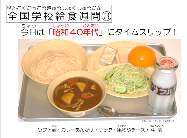 24日から30日まで「全国学校給食週間」です。給食の歴史や給食の意味を考える一週間です。 住吉小学校と田無二中では金曜日までを「全国学校給食週間メニュー」にしています。今日の給食は、昭和30年から40年代頃に人気だった献立になっています。「くじらの竜田揚げ」は当時の子供たちにとってとても貴重な「タンパク源」でした。しかhし、現代では 中々食べることの出来ない 貴重な食材となっています。 残さずにいただきたいですね。