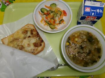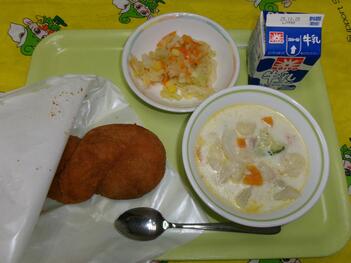 ★スコットブロス・・・イギリス・スコットランドの大麦と肉・野菜・豆の入った具沢山スープのことで伝統的な郷土料理の一つです。本場では、「ラム肉」を使用しますが給食では「鶏肉」を使用し作っています。 一つのお椀の中に栄養が沢山詰まったスープになっています。夏の疲れをとるためにも、しっかりいただきたいですね。