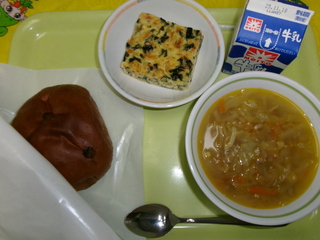 ★今日の「きゃべすき丼」は市内統一献立になっています。市内農家さんの野菜をふんだんに使用して作っています。今日の「キャベツ」は1年生が地産地消プロジェクトでお世話になった「下田農園」さんからのキャベツです。美味しそうに成長したキャベツを今朝収穫し給食で食べることができます。地産地消ならではですね。残さずにいただきましょう。
