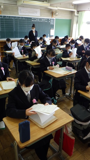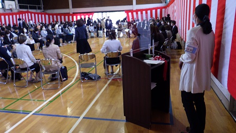 受付の始まる午前8時30分には標準服に身を包んで緊張しながら中学生になった生徒と保護者が正門付近で記念撮影をするなどしていました。新入生は教室、保護者は体育館へと移動して定刻の9時30分には感染防止のため短縮された内容となりましたが入学を祝うあたたかい式が行われました。