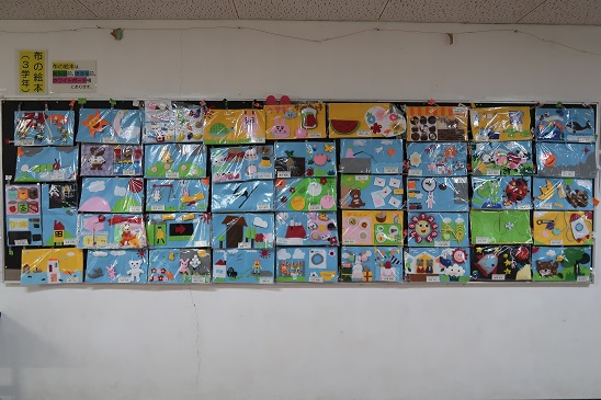 家庭科の授業でフェルトで作った絵本を1階の廊下等に展示中です。現在三者面談等で来校の折にぜひ見学してください。