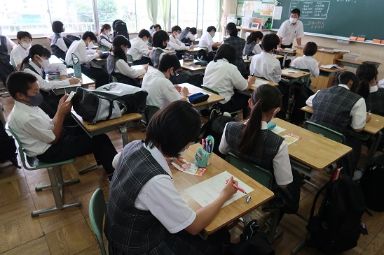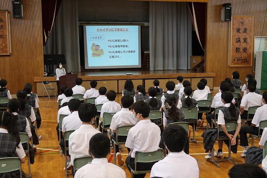 道徳の時間として1年生は現職の弁護士から人権について、特にいじめ防止に係る講演を聞きました。昨年度は新型コロナウイルス感染症対策のために実施できませんでしたが、市内の中学校ではすべて実施しています。今年は、弁護の方をお迎えして話を聞くことができました。毎回話の中心になるのは、同じ都内で数十年前に起きた悲しいいじめによる一人の中学生の悲劇を取り上げてみんなで考えました。許されるいじめはあるの?…いじめをなくすためにそれぞれの立場でできることは?…1年生の全員が自分のこととして真剣に考えました。