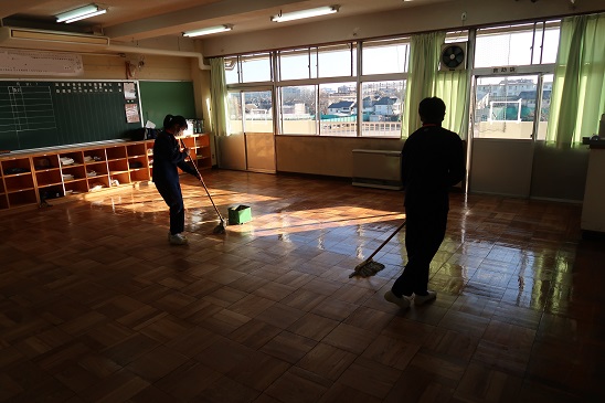 年末の大掃除を実施しました。生徒たちは自分たちの教室を中心に大がかりな清掃活動を行いました。きれいになった教室の床は最後にはワックスを塗ってきれいに仕上げました。