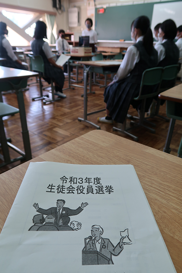 9月のオンライン授業の影響で遅れていた生徒会役員選挙が実施されました。昨年度はタブレットパソコンが導入されていなかったので感染症対策のため放送のみでしたが、今年度はオンラインで候補者と応援者の演説の様子を見てから投票することがてきました。