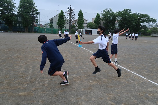 運動会では全員が出番ある競技が2つあります。その一つが全員リレーです。まずは差のつきやすいバトンパスの精度を上げるための基礎練習を行いました。