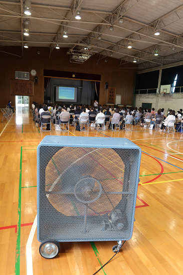 この日は午後から気温も上昇、少しでも涼しくと大型送風機