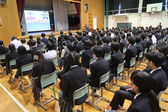 土曜授業参観とセーフティ教室を行いました。1時目、3時間目は授業公開、2時間目は生徒・保護者向けに「使えている?ネット・スマホをスマートに」という講演を行いました。講師に来ていただいたのは東京都・ファミリeルールの方で、今回はスマホの使い方だけでなくアプリやサイトの利用規約を安易に「承認」をしてしまってトラブルになる場面での例と対応でした。