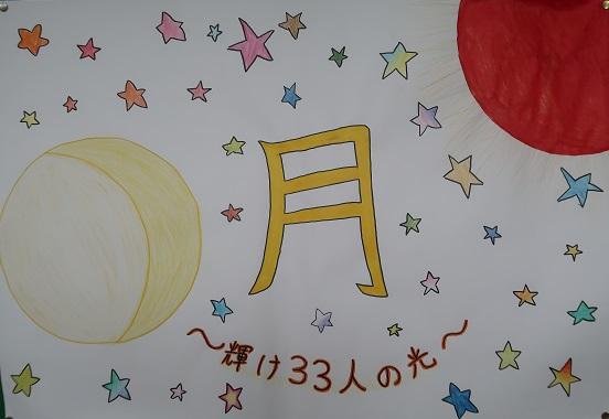 月というのは、太陽の光によって光っています。だから、私たちも月と同じように一人で抱え込むのではなく誰かの力を借りてでもいいので、一人一人が助け合い、あきらめずに最後まで成し遂げよう! という思いが込められています。一人一人が美しく輝く一つの星になれるよう成長していきたいと思っています。また、「月」には優しさや、だんだんと満ちていく様子から、成長や発展の象徴とも言われています。そこで徐々に成長していって、いつか太陽のように、自ら光輝き、誰かを照らせる存在にまで成長しよう! という思いを込めて、〜輝け33人の光〜というサブタイトルをつけました。私たち2年D組は「月〜輝け33人の光〜」を目標にこれから1年間頑張っていこうと思っています。