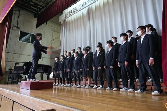 1年生に続いて2年生がリハーサルを行いました。昨年度はコロナ禍で実施していないので、1年生同様に初めてのコンクールです。しかし、今までの中学校生活で得られた団結力や協力する力を生かしてりっぱな合唱を披露していました。