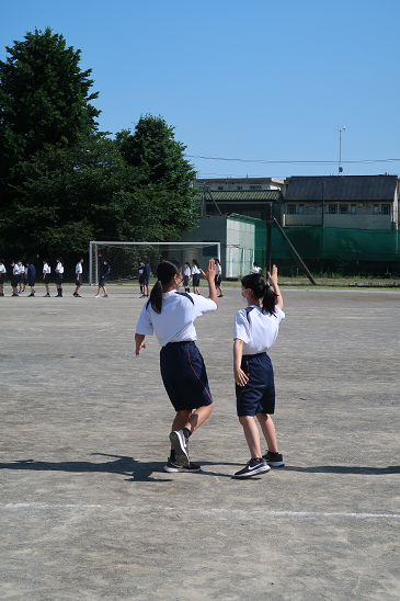 練習の成功?に友達とハイタッチ