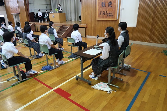 今年の意見発表会は学年発表までですが、トップバッターとして2年生の学年発表が体育館で行われました。各クラスの代表になった10人の生徒たちが壇上で堂々と発表を行いました。緊張しながらも昨年度の成果と先輩の発表を体験している2年生は一歩上手に発表ができていたようです。