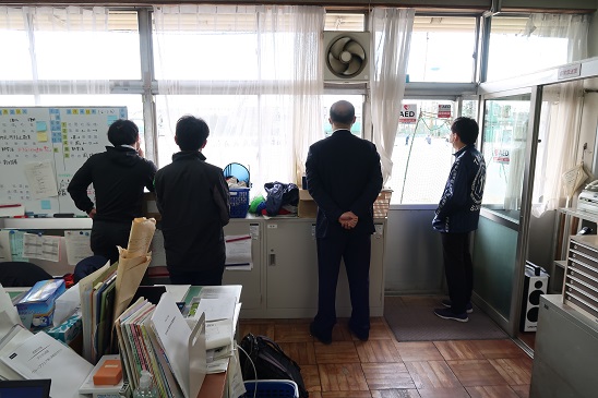 職員室から保健体育のリレーの様子を真剣に見入る担任の先生たち