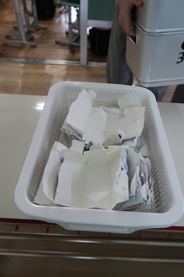 さっそく、飲み終わった牛乳パックを生徒一人ひとりが手を使って給食後に行いました。最初は慣れない作業で戸惑う生徒もいましたが、1分足らずできれいに開いていっていました。その後先生たちの手で水洗い、廊下の隅で乾燥させて、リサイクル業者へ回収となります。