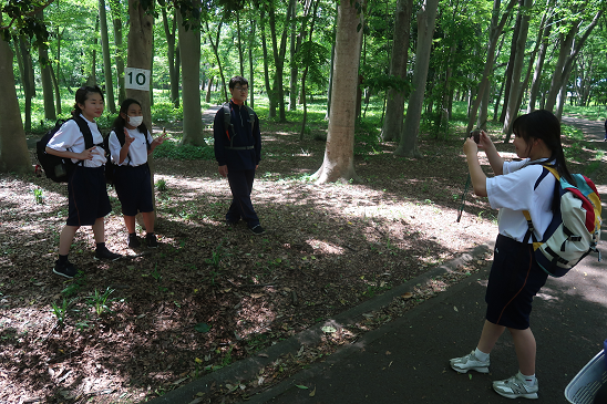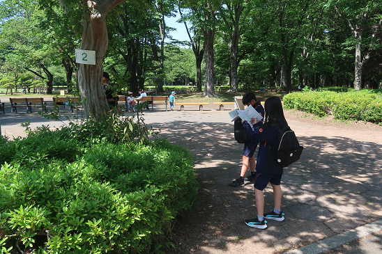 広場でお昼ご飯を食べた生徒たちは今回の校外学習の学習ポイントの2つ目の小金井公園グリーンアドベンチャー「この木なんの木」を行います。これはあらかじめくじ引きで決められた東西にある木を探して写真などを撮るミッションです。広い公園内を目的の木を目指して歩く生徒の様子をご紹介します。