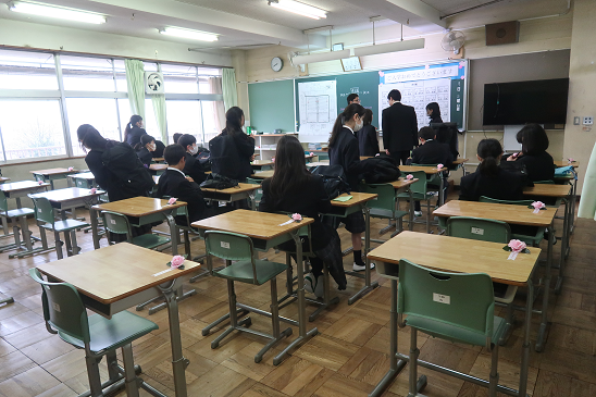教室で 式が終わり、ほっとして担任の先生からの話を聞きます。