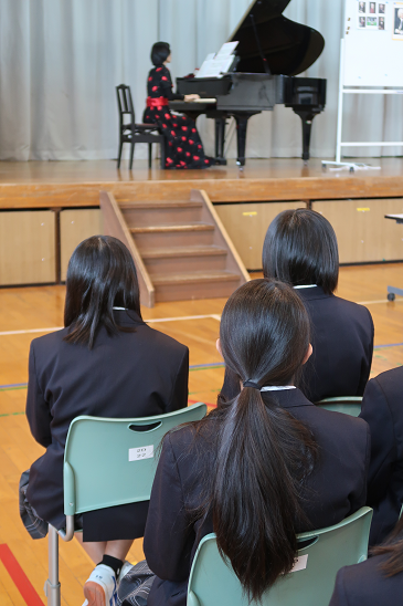 中学校の数校を毎年ピアノを弾かれているプロの方が演奏会を行ってくれました。主催は西東京市ロータリークラブで、前回の演奏会は二中では令和3年10月でした。演奏してくれたのは前回と同じ市内在住のピアニスト、佐藤恵美さんです。