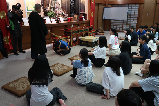 法話が終わって、警策の体験をしたい人は残って体験…叩かれるが気持ちを引き締める・・・